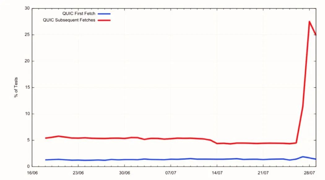显然,对于替代服务指令触发的类似Chrome浏览器的行为,实验达到了预期的效果。在后续的周期性测量中,我们发现所有测试中QUIC的使用比例都提高到了50%以上。