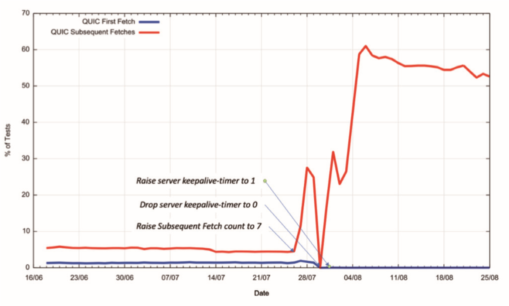 值得注意的是,在支持QUIC的测试样本中,有略高于一半的样本在第二次请求时切换到了QUIC,其余的在第三次或以后的请求中切换。而在大约10%的请求序列中,客户端转而使用基于TCP的TLS。此外,keeplive定时器设置为1秒有一个副作用,它会禁止在第一次请求时使用QUIC(即通过DNS HTTPS资源记录触发QUIC的使用,这种方法主要在Safari浏览器中实现)。