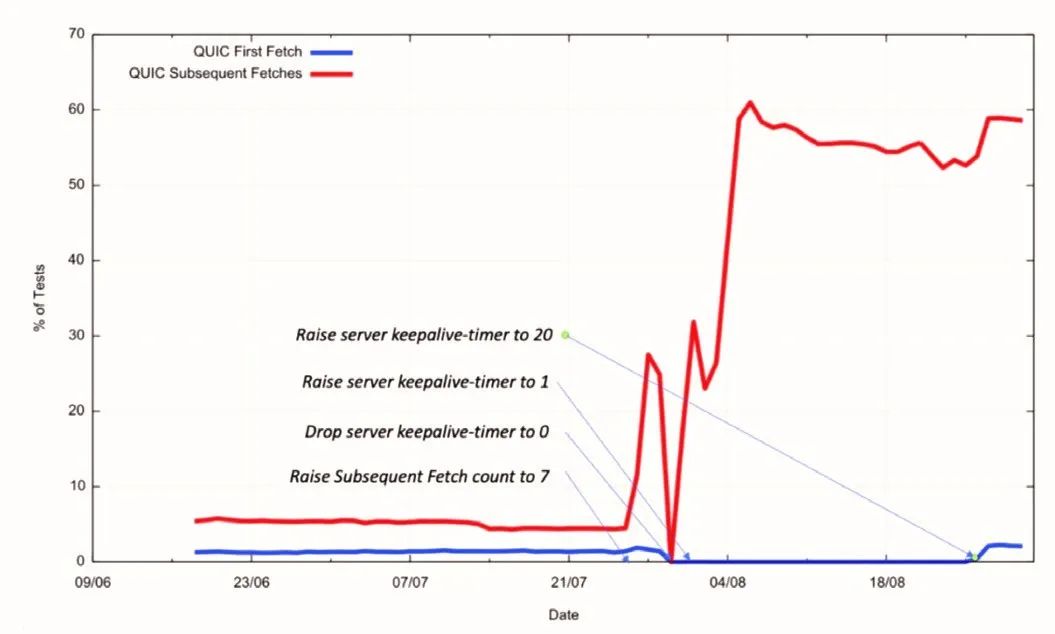 我们尝试将Nginx服务器的keepalive时间设置为零秒,但这产生了意想不到的副作用,即禁用了服务器中的所有QUIC支持。显然,这不是预期的结果!