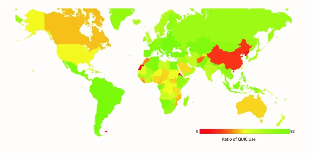 无论在何种情况下,在全网有超过50%的部署率都是一项显著的成就。全球QUIC支持率的分布地图展示了几乎所有经济体对QUIC的支持水平,唯一一个支持率低于20%的主要经济体是中国,如图5所示。