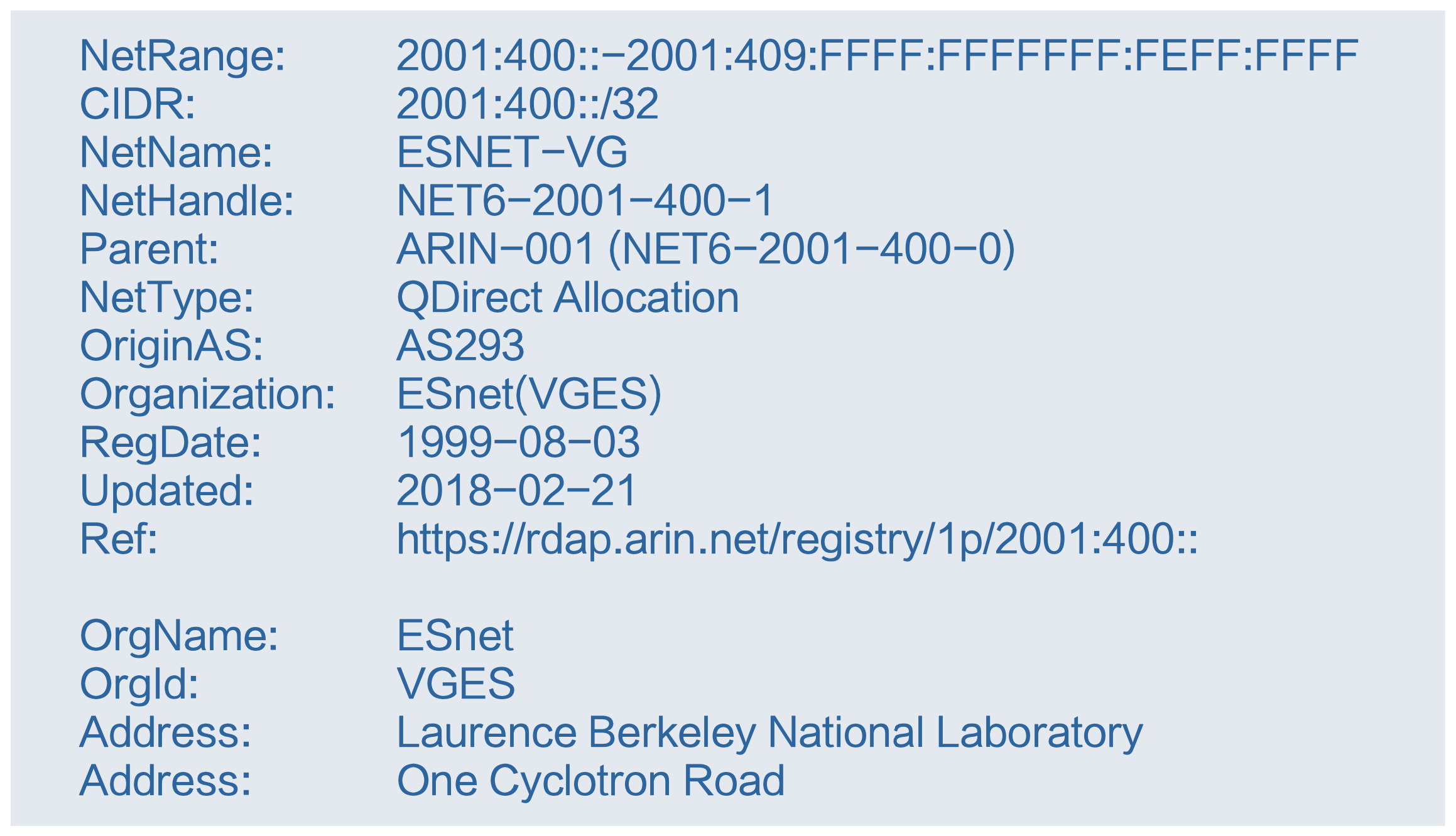 图1 北美互联网注册中心(ARIN)将地址块2001:400::/23中的第一个区块,分配给美国能源科学网络(ESnet)