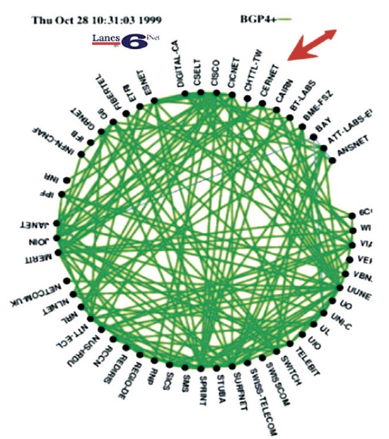 1996年,国际IPv6试验网6Bone建立,欧洲、美洲、亚洲的许多国家和组织加入其中。6Bone成为当时全球IPv6研究者、开发者和实践者的主要平台。图为1999年10月6Bone的BGP4+的链接度(BGP4+从传统的边界网关协议BGP/BGP4扩展而来,支持IPv6和其他网络层协议)。其中,ESnet、WIDE、CERNET的BGP4+的链接度相差不大,显示了CERNET的技术领先性。