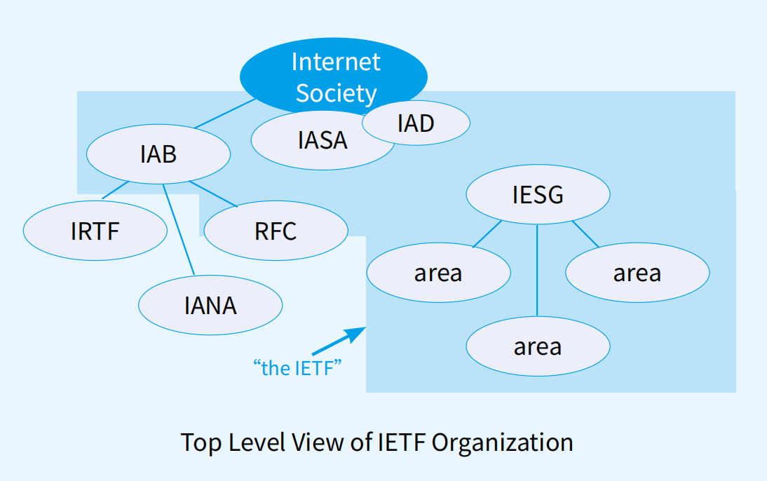 互联网体系结构委员会(IAB)则处于相对宏观的位置,主要职责是从整体层面对互联网体系结构进行审视与把关—不仅对IETF及其管理机构的运行进行监督,也承担着协调IETF与其他国际标准化组织(如IEEE、W3C、ITU等)关系的职责。