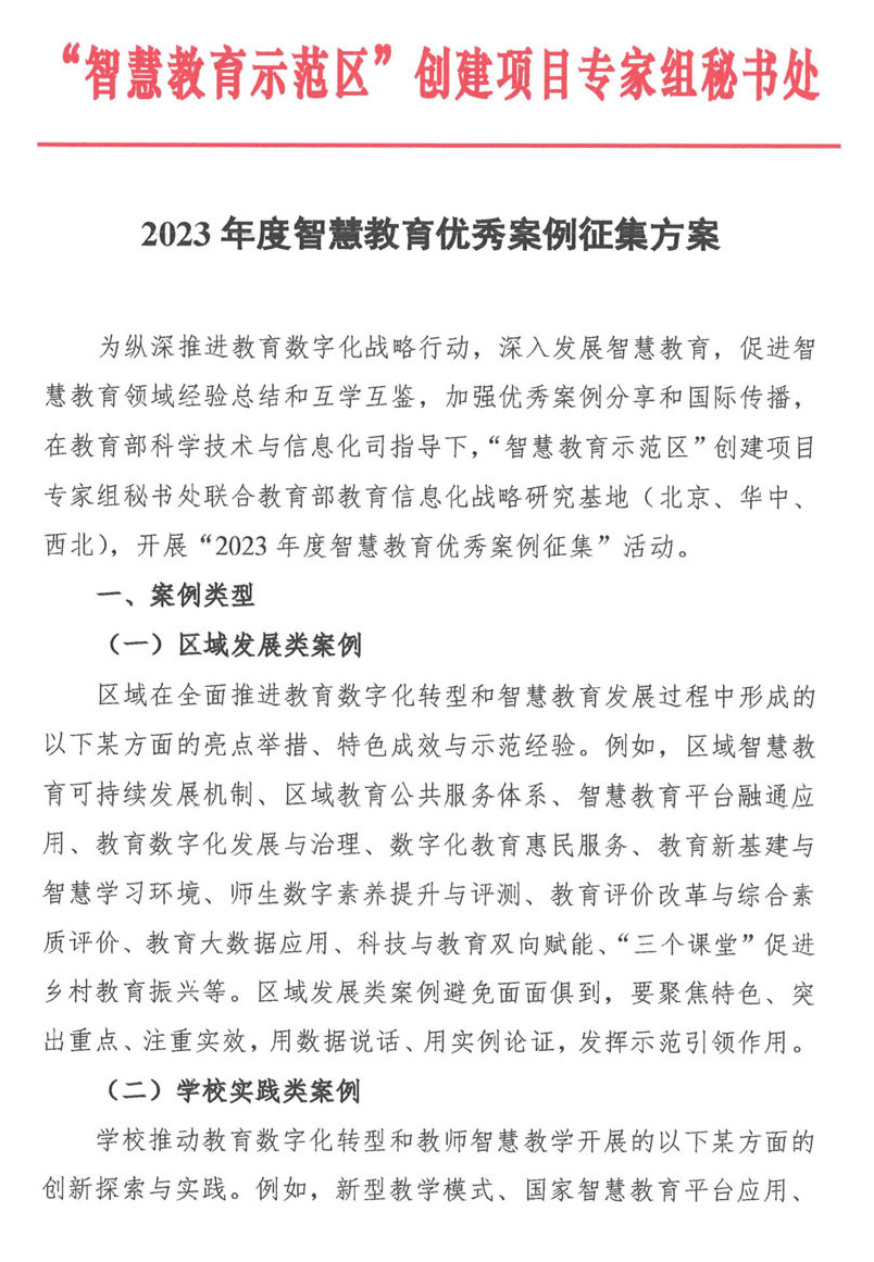 日前,教育部“智慧教育示范区”创建项目专家组秘书处发布最新消息,在教育部科学技术与信息化司指导下,“智慧教育示范区”创建项目专家组秘书处联合教育部教育信息化战略研究基地(北京、华中、西北),开展“2023年度智慧教育优秀案例征集”活动。