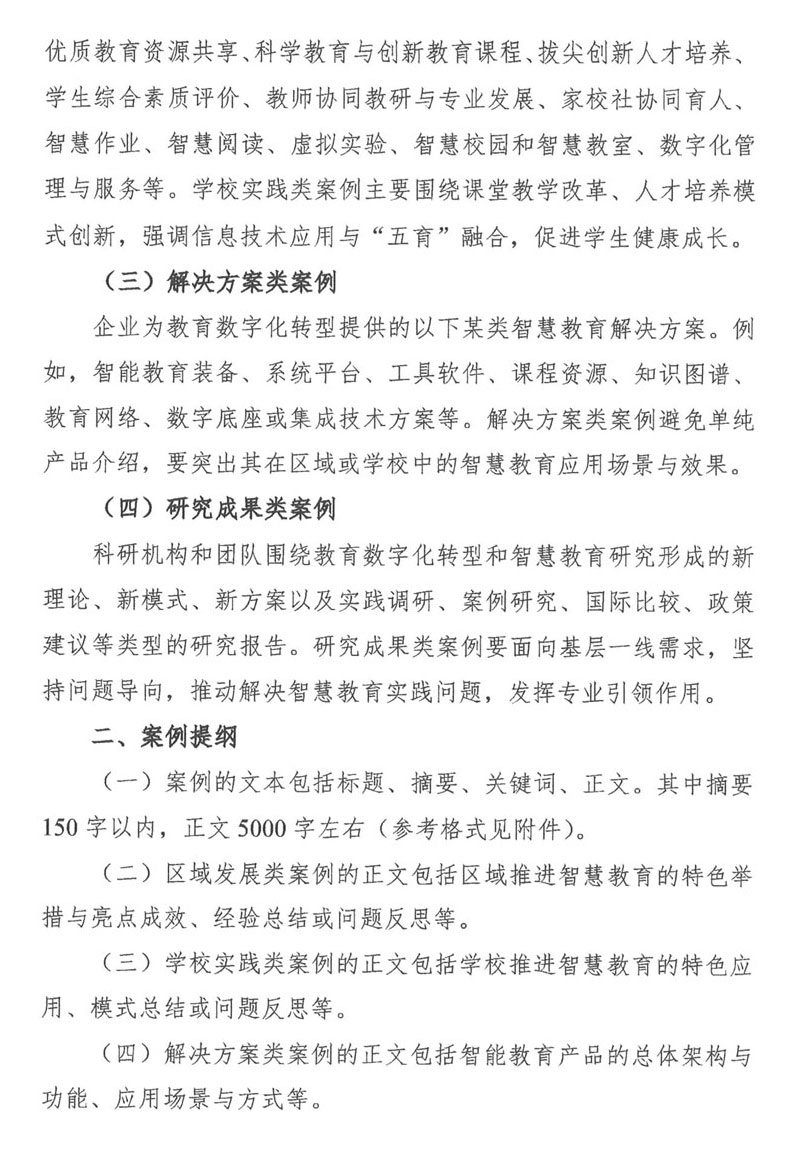 (一)自愿申报或推荐,拟遴选智慧教育优秀案例150个左右,其中,区域发展类案例30个左右,学校实践类案例100个左右,解决方案类案例10个,研究成果类案例10个。