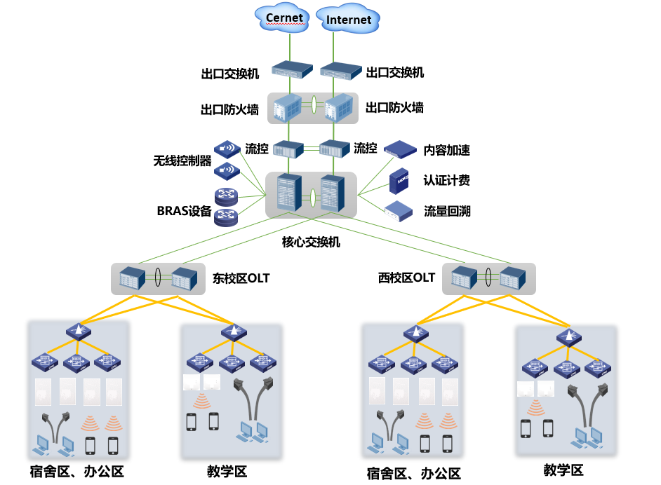 校园网整体解决方案采用BRAS+核心交换机+OLT(光线路终端)+ONU(光网络单元)+Wi-Fi 6无线AP的架构。二层扁平化组网架构适应校园网的发展趋势,BRAS、核心交换机、OLT统一部署在校园网核心机房,采用无源分光器通过光纤直达楼宇内部,末端通过网线连接ONU(支持POE功能)和无线AP,完成有线无线一体化组网,实现了教学办公网、物联网、一卡通专网、视频监控网等多张网的全面融合。