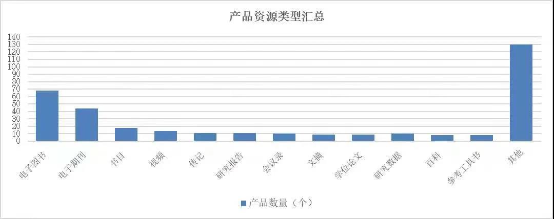 学位论文类、书目类、视频类、传记类、研究报告类和科技报告类资源产品紧随其后,如“万方数据科慧平台”、中国科技出版公司的“科学智库”、“博学易知考研数据库”等。