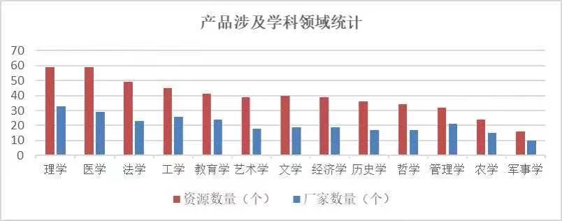 其中,“理学”资源产品数量最多,共计有33家资源服务商的59个资源产品;