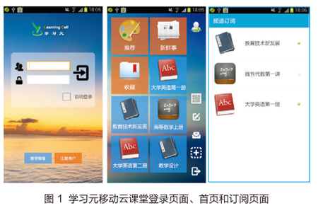 为了满足移动学习对学习资源所提出的生成与进化、智能与适应等多方面的新要求,北京师范大学“移动学习”教育部- 中国移动联合实验室提出了适合移动学习环境与非正式学习的一种新型学习资源组织方式--学习元,并积极探索 “学习元移动云课堂”的开发与应用。学习元(learning cell)一方面表示“小粒度”,另一方面则表示“学习的初始”,同时具有“生长”、“进化”的含义。学习元为学习者提供微型学习资源和学习服务,能够根据学习者的个性化需求提供课程推荐,学习者只需要简单地订阅自己感兴趣的课程,即可享受学习元所提供的丰富的学习服务。同时,随着学习者参与课程的持续和深入,学习元中的课程也是不断地进化,学习者不仅仅是知识的获取者更是知识的生成者。“学习元移动云课堂”的相关页面如图1所示。