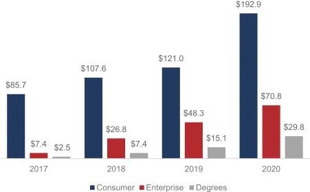 世界银行在2017年曾表示,全球2亿大学生中,许多人不具备职业技能。HolonIQ数据显示,2019年全球高等教育支出为2.2万亿美元。在线学位支出为360亿美元,预计到2025年将达到740亿美元。