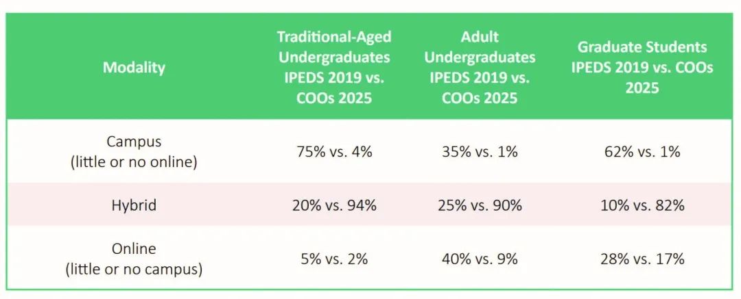 非营利组织Quality Matters和高等教育市场研究公司Encoura's Eduventures最新发布的调查报告显示,在接受调查的首席网络官(Chief Online Officers)中,超过90%的人表示,到2025年,校园里的本科生都将以某种混合形式学习,而在新冠疫情初期,混合式学习的学生仅占20%(图1)。