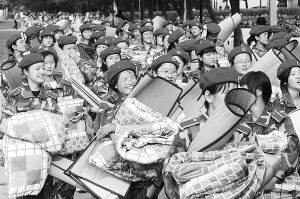 照片:2007年9月2日,江苏扬州某大学新生入学军训,众多女生正在操场上叠被。(资料配图)范友林摄