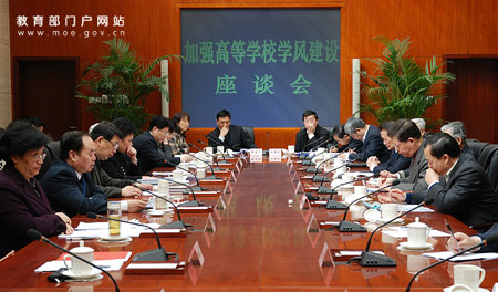 3月15日,教育部在京召开高校学术风气建设座谈会,与会人员围绕目前高校学风建设的现状、存在的主要问题及产生原因进行了深入讨论,并就进一步加强和改进高校学风建设提出了建议和意见。教育部部长周济强调,必须标本兼治,惩防并举,切实加强高校学术道德和学风建设。