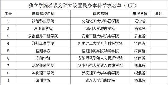 2.独立学院转设为独立设置民办本科学校名单(9所)