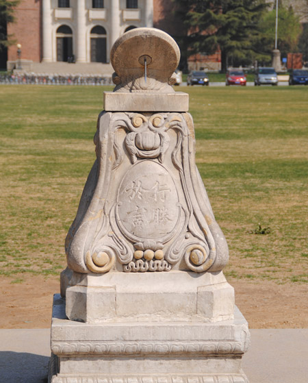 据当时主持其事的庚申级校友华凤翔回忆,上部的日晷盘由美国数学教员海晏士(Heinz)依照北京经纬度绘制,委托北京著名景泰蓝厂老天利以银胎珐琅烧成。其晷底座用汉白玉请工匠在校内雕作而成,并四面刻文,为二中二洋。其正面(南面)中文“庚申级立”,背面(北面)英文为Class 1920。一侧中文“行胜于言”,另一侧为“行胜于言”的拉丁译文“Facta Non Verba”。中文请庚申级同学邹宗彦之兄邹宗善书(邹宗善为南开大学生,曾与周恩来总理同学),外文由华凤翔学长书写。经过数月的精心制作,1920年暑期日晷完工,摆放在高等科教室右侧草坪上。