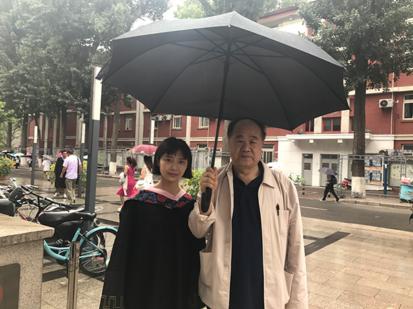 莫言在雨中和一名北师大电影学专业的毕业生合影 澎湃新闻记者 韩晓彤 图
