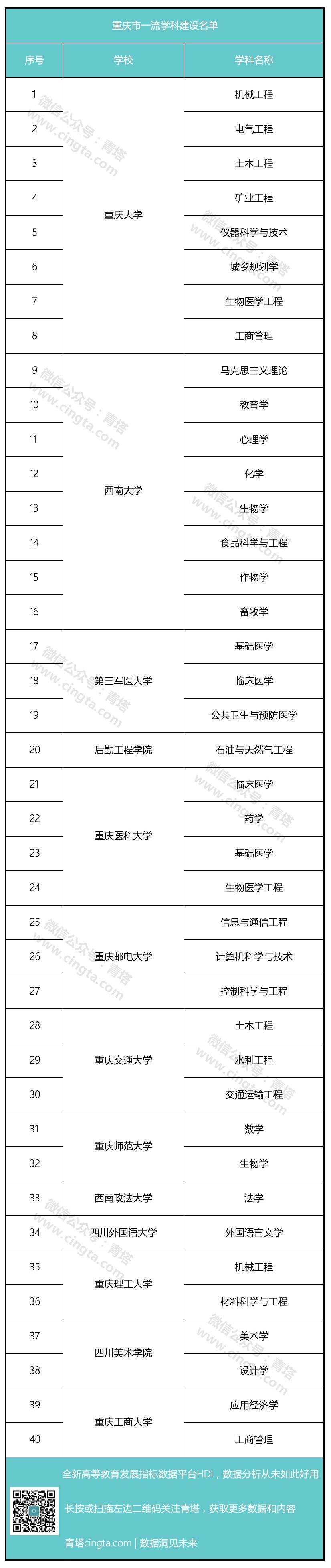 从8月21日开始,重庆市教委官网正式公示了重庆市一流学科建设名单,包括重庆大学、西南大学等13所高校的40个学科入选。