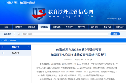 9月26日,教育部教育涉外监管信息网发布2016年第2号留学预警。预警称,美国教育部8月25日宣布禁止ITT技术学院(ITT Tech)招收新生,主要原因是该校经济状况窘迫,主要收入依靠申请联邦政府贷款;学校教学管理混乱,无法达到认证标准。