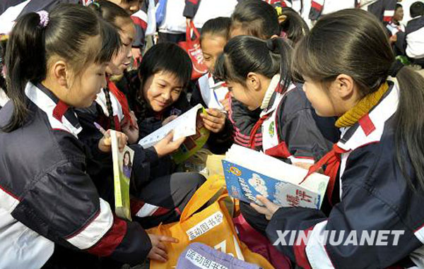 1月18日,江西省定南县实验小学学生带着自己的“流动图书袋”和同学交换图书。