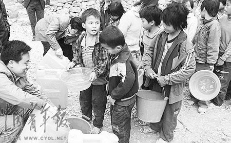 广西巴马县东山乡江团村广汇希望小学迎来了乡里的送水车,学生们拿出各种盛水器皿,把水运到山坡下学校的蓄水池里。