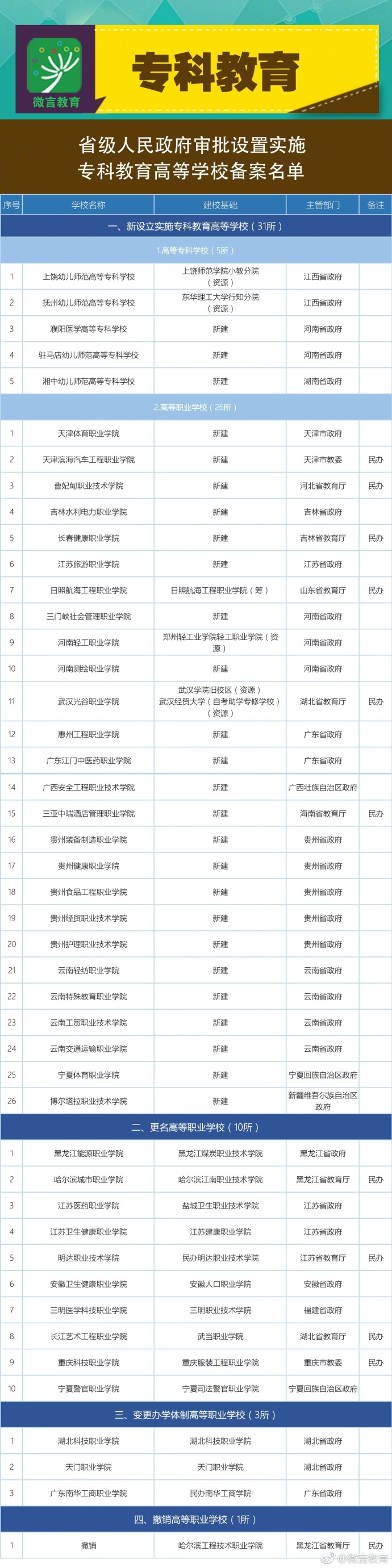 近日,教育部办公厅印发《关于公布实施专科教育高等学校备案名单的函》,公布了省级人民政府审批设置的45所实施专科教育高等学校备案名单。其中,新设立的实施专科教育高等学校备案名单有31所,更名、合并、撤销的实施专科教育高等学校备案名单有14所。