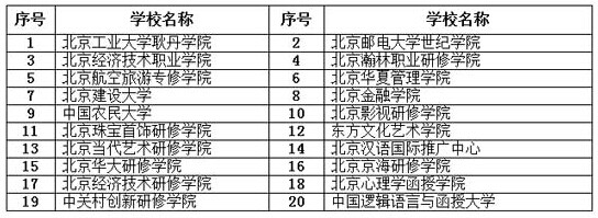 据悉,通过不断监督检查,学校依法诚信办学意识逐渐加强,招生宣传工作逐步规范。自4月份以来的网络监测中,北京工业大学耿丹学院、北京经济技术职业学院、北京航空旅游专修学院等20所民办高校能做到诚信宣传,招生宣传工作规范,在监测中没有发现违规宣传问题,具体名单见下表: