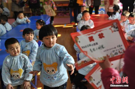 资料图:幼儿园老师为孩子发奖状。武俊杰 摄