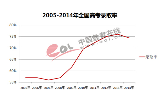 根据教育部统计数据,2014年全国高考录取率为74.33%,较2013年下降近两个百分点。这是全国高考录取率近9年来的首次下降。