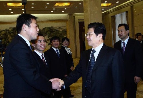 4月15日,中共中央政治局委员、全国人大常委会副委员长王兆国在北京会见全国优秀中职毕业生报告团全体成员。当日,共青团中央、教育部、人力资源和社会保障部联合举办的“我的青春故事”全国优秀中职毕业生报告会在北京举行。(新华社记者 袁满 摄)