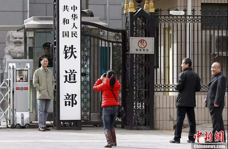资料图:2013年3月10日,提请全国人大会议审议的国务院机构改革和职能转变方案,将不再保留铁道部,实行铁路政企分开。图为铁路系统职工在铁道部门前拍照留念。(中新社发刘关关 摄)