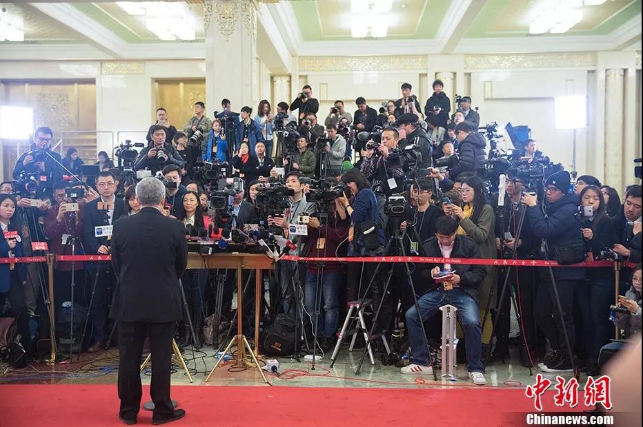 资料图:2017年3月5日,十二届全国人大五次会议开幕。记者云集“部长通道”。(中新社记者 泱波 摄)