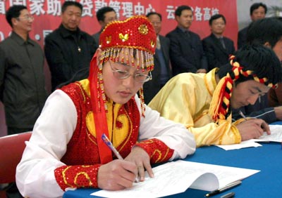 资料照片:中国农业银行云南分行与云南省各高校签署《银校合作协议书》,图为两位少数民族贫困学生正在签订国家助学贷款合同。 (新华社发)