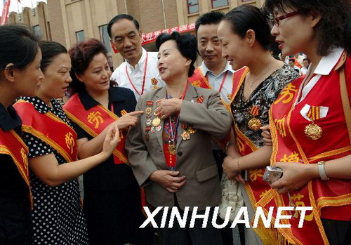 8月7日,1989年当选全国劳动模范的记蕴霞(右四)和新当选的劳模进行交流。当日,来自全国各地的800名全国劳动模范在北戴河开始为期1周的休养。新华社记者 何俊昌 摄