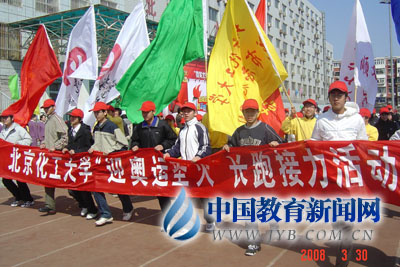 3月30日,北京化工大学学生开展迎奥运圣火长跑接力活动。记者 纪秀君 摄