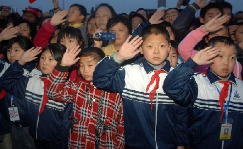 4月21日,北京天安门广场在例行的升国旗仪式后,为青海玉树地震遇难同胞降半旗致哀。这是来自河北廊坊市的小学生向国旗行少先队队礼。新华社记者公磊摄