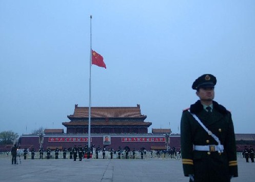 4月21日,北京天安门广场下半旗,向玉树地震遇难同胞致哀。 新华社记者公磊摄