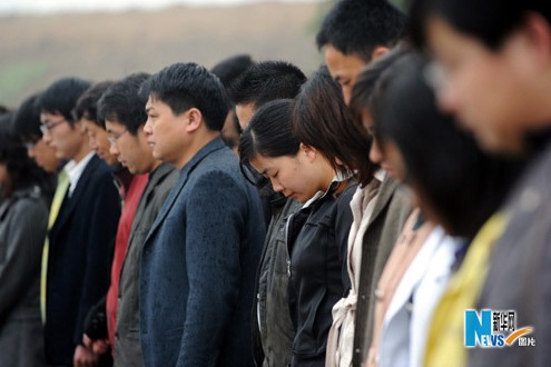 4月21日,合肥工业大学师生向玉树地震遇难同胞默哀。当日清晨7时30分,安徽合肥工业大学千余名师生在校南门广场举行降半旗仪式和默哀3分钟活动,深切哀悼青海玉树地震遇难同胞。新华社记者李健摄