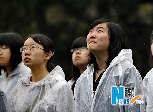 4月21日,复旦大学的学生们在雨中参加降半旗仪式。当日清晨7时30分,复旦大学部分学生代表在校园内举行降半旗仪式和默哀3分钟活动,并撞响“世纪钟”,深切哀悼青海玉树地震遇难同胞。新华社记者 刘颖 摄