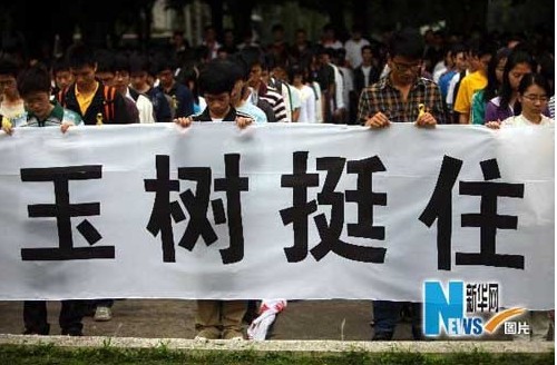 4月21日,学子们打出“玉树挺住”的横幅,为玉树人民加油。当日7时30分,千余名大学生在广州华南理工大学学校广场举行降半旗仪式,深切哀悼青海玉树地震遇难者。新华社记者吴鲁摄