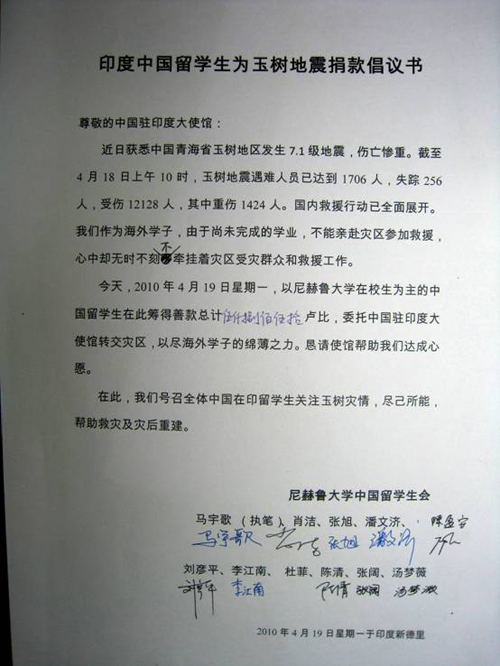 今天,2010年4月19日星期一,以尼赫鲁大学在校生为主的中国留学生在此筹得善款总计伍千捌佰伍拾卢比,委托中国驻印度大使馆转交灾区,以尽海外学子的绵薄之力。恳请使馆帮助我们达成心愿。