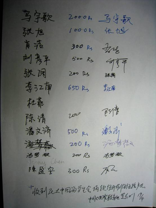 马宇歌执笔起草的这份倡议书,马上在同学们中间进行传阅,得到了尼赫鲁大学全体中国留学生的积极响应。肖洁、张旭、潘文济、陈盈安、刘彦平、李江南、杜菲、陈清、张阔、汤梦薇等同学,各自以中国学生会骨干成员的身份,踊跃在上面签字声援灾区民众。同时各自压缩生活费用来捐款,省吃俭用以实际行动支援祖国抗震救灾。大家不约而同,表现出了非常高的感人至深的成熟觉悟、人文精神。