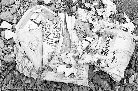 2008年5月,汉旺,废墟上的课本。 记者 晋永权 摄