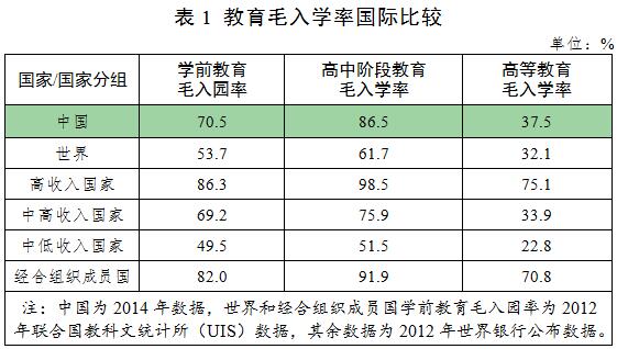 一是教育事业总体发展水平进入世界中上行列。2014年,我国学前三年毛入园率为70.5%,达到中高收入国家平均水平。小学净入学率为99.8%、初中毛入学率为103.5%,普及率高于高收入国家平均水平。高中阶段教育毛入学率为86.5%,高于中高收入国家平均水平。高等教育毛入学率为37.5%,超过中高收入国家平均水平。主要劳动年龄人口人均受教育年限进一步提高,其中受过高等教育的比例达15.83%。教育普及程度和人力资源开发水平的大幅提升,有效保障了人民群众受教育权利,提高了国民素质,改善了我国人力资源结构,为经济社会发展提供了强有力支撑。