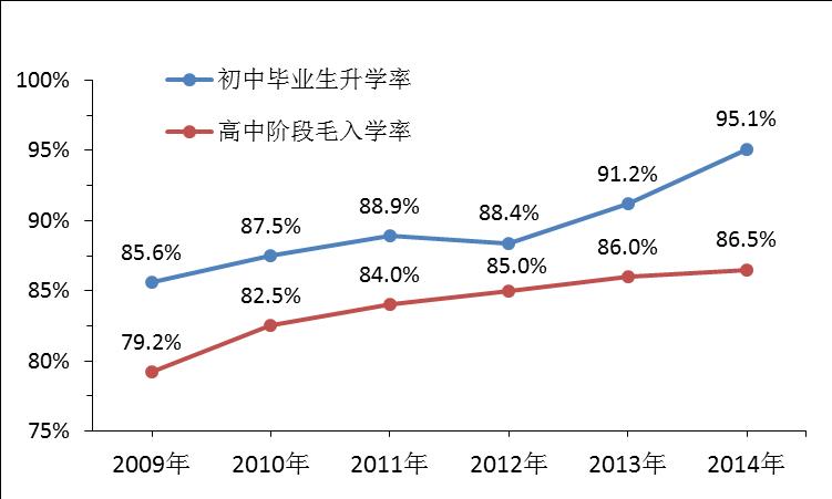 ——高中阶段教育普及程度大幅提升,多样化发展稳步推进。高中阶段教育机会明显增加,2014年初中毕业生升学率达95.1%,比2009年提高9.8个百分点;高中阶段毛入学率达86.5%,比2009年提高7.3个百分点。全面启动普通高中课程修订,合理确定课程容量和难度,增强课程的适宜性、可操作性,充分发挥课标对教育教学的统领和指导作用。各地围绕普通高中多样化发展大胆探索,加强普通高中教育与职业教育的融通,不断扩大优质高中教育资源,着力为学生提供多样化成长渠道。