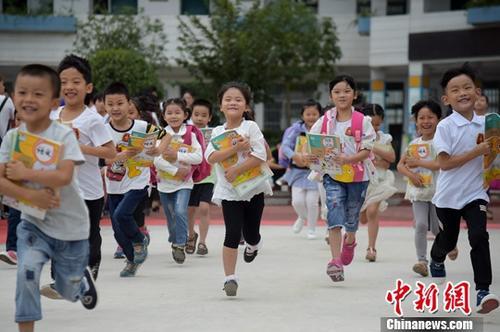 资料图:一年级的新同学怀抱新书本开心的走出教室,奔跑在校园里。中新社记者张娅子摄