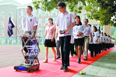 北京市第十八中学开学典礼上,机器人领衔带领新生走红地毯。记者吴镝摄