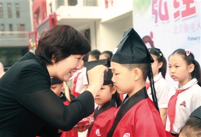 9月1日,北京邮电大学附属小学全体一年级新生身着汉服,参与“正衣冠”、“点朱砂”等仪式,体验了一次原汁原味的“开笔礼”后,正式开启了小学生活。